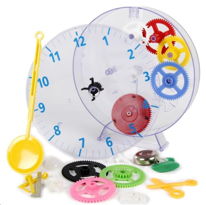 • detská stavebnica analógových mechanických hodín • poháňané pružinou • materiál plast • nevhodné pre deti do 3 rokov • priemer ciferníka 196 mm • priehľadný kryt, farebné diely