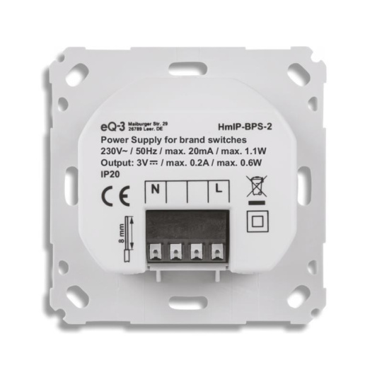 Napájací zdroj batériových komponentov 55 mm (HmIP-BPS-2) je súčasťou systému chytrej domácnosti Homematic IP a slúži ako praktická dokovacia stanica pre napájanie batériových komponentov o veľkosti 55 mm s pripojením do existujúcej elektrickej siete 230 V a umiestnením do štandardného zápustného boxu pod omietku.
