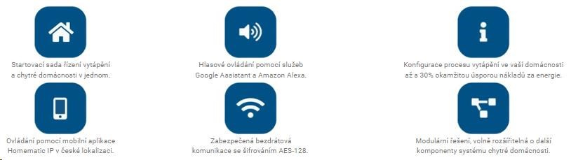 Rozšírená štartovacia sada na riadenie vykurovania HmIP-SET2 určená na počiatočnú integráciu inteligentnej domácnosti Homematic IP. Sada obsahuje šesť základných zariadení pre spoľahlivé riešenie regulácie vykurovania a vzdialené ovládanie priestourtej teploty v miestnosti podľa individuálnych potrieb, čo vedie k okamžitej úspore a zníženiu výdavkov na energie až o 30 %. Sada obsahuje Centrálnu jednotku HmIP-HAP, 3x Termostatickú hlavicu HmIP-eTRV-2, 2x Nástenný termostat so senzorom teploty a vlhkosti HmIP-WTH-1 a bezplatnú mobilnú aplikáciu v CZ lokalizácii dostupnú pre operačný systém Android a iOS.