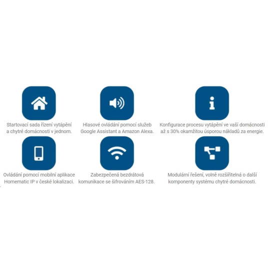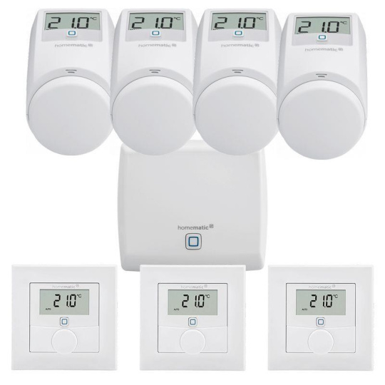 Štartovacia sada pre riadenie vykurovania HmIP-SET3 určená pre počiatočnú integráciu inteligentnej domácnosti Homematic IP. Sada obsahuje osem základných prvkov pre spoľahlivé riešenie regulácie vykurovania a vzdialené riadenie priestorovej teploty v miestnosti podľa individuálnych potrieb, čo vedie k okamžitej úspore a zníženiu výdavkov na energie až o 30 %. Sada obsahuje Centrálnu jednotku HmIP-HAP, 4x Termostatickú hlavicu HmIP-eTRV-2, 3x Nástenný termostat so senzorom teploty a vlhkosti HmIP-WTH-1 a bezplatnú mobilnú aplikáciu v CZ lokalizácii dostupnú pre operačný systém Android a iOS.