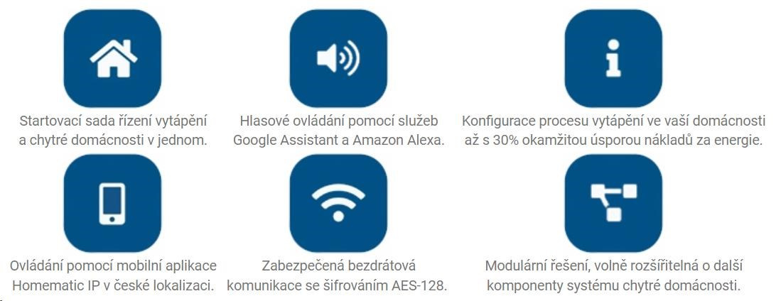 Štartovacia sada pre riadenie vykurovania HmIP-SET3 určená pre počiatočnú integráciu inteligentnej domácnosti Homematic IP. Sada obsahuje osem základných prvkov pre spoľahlivé riešenie regulácie vykurovania a vzdialené riadenie priestorovej teploty v miestnosti podľa individuálnych potrieb, čo vedie k okamžitej úspore a zníženiu výdavkov na energie až o 30 %. Sada obsahuje Centrálnu jednotku HmIP-HAP, 4x Termostatickú hlavicu HmIP-eTRV-2, 3x Nástenný termostat so senzorom teploty a vlhkosti HmIP-WTH-1 a bezplatnú mobilnú aplikáciu v CZ lokalizácii dostupnú pre operačný systém Android a iOS.