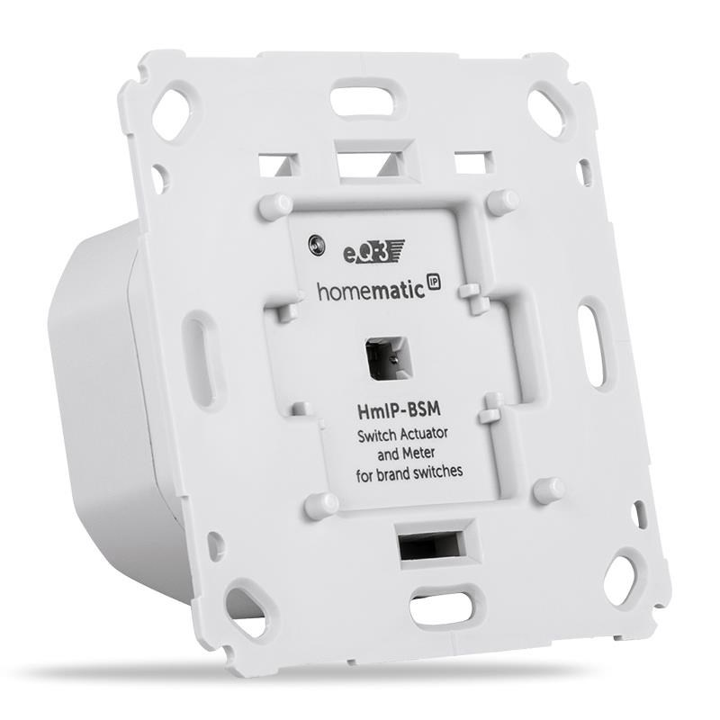 Programovateľný bezdrôtový Spínací akčný člen s meraním (HmIP-BSM-I) pre zápustnú montáž, napájaný zo siete 230 V, je súčasťou systému chytrej domácnosti Homematic IP.
