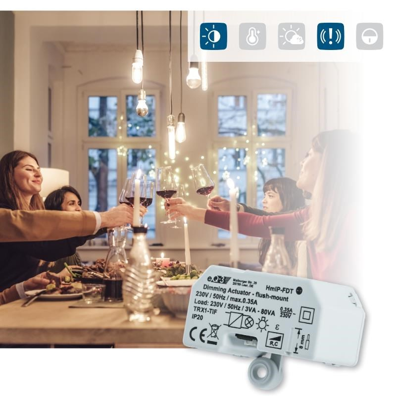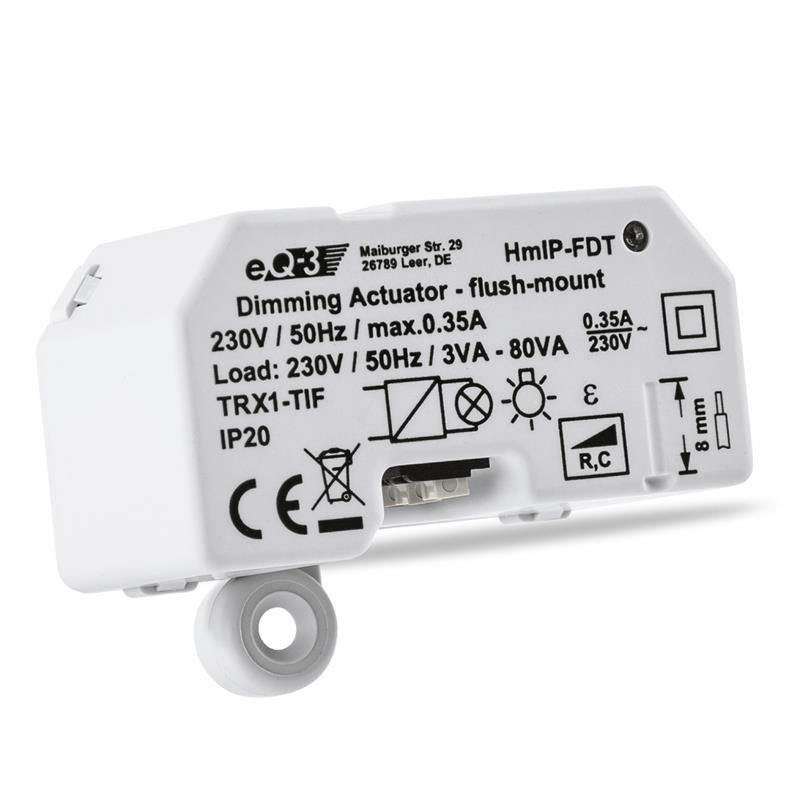 Stmievací akčný člen (HmIP-FDT) sa montuje do štandardnej zapustenej krabice pod omietku alebo do krabice na povrchovú montáž s pripojením do siete 230 V. Bezdrôtová komunikácia ponúka možnosť inštalácie bez potreby dodatočného kábla. To znamená, že akčný člen je možné umiestniť v mieste s pripraveným alebo existujúcim elektrickým rozvodom siete 230 V.