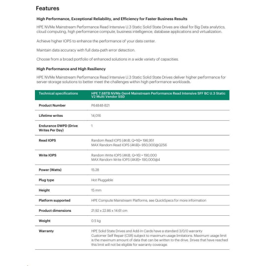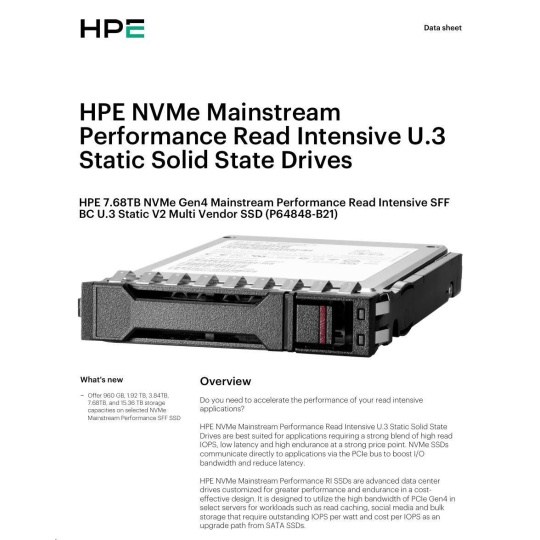 HPE 7.68TB NVMe Gen4 Mainstream Performance Read Intensive SFF BC U.3 Static V2 Multi Vendor SSD P64848-B21 RENEW.