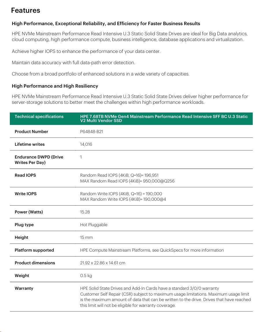HPE 7.68TB NVMe Gen4 Mainstream Performance Read Intensive SFF BC U.3 Static V2 Multi Vendor SSD P64848-B21 RENEW.
