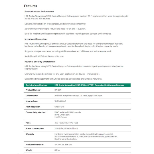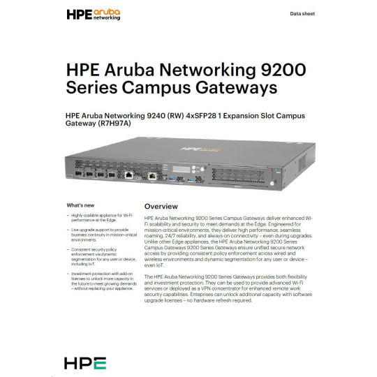 HPE Aruba Networking 9240 (RW) 4xSFP28 1 Expansion Slot Campus Gateway R7H97A RENEW.
