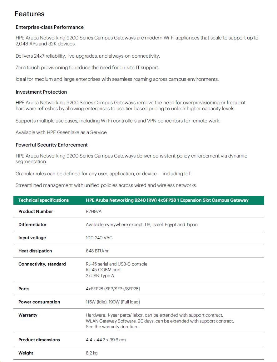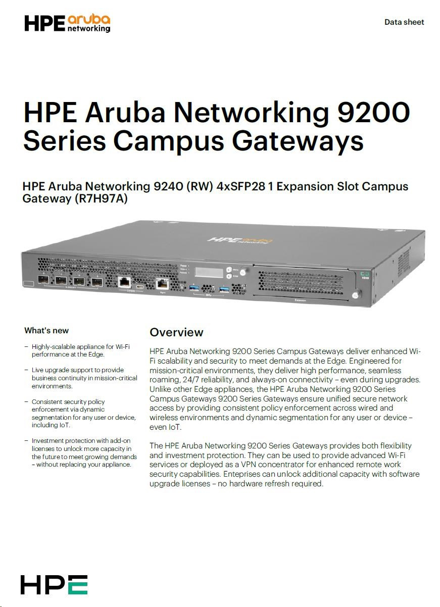 HPE Aruba Networking 9240 (RW) 4xSFP28 1 Expansion Slot Campus Gateway R7H97A RENEW.