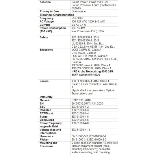 | Emissions | VCCI-CISPR 32, Class A; CNS 13438; ICES-003 Issue 6 Class A; FCC CFR 47 Part 15, Class A; EN 55032: 2015 +AC:2016 / CISPR-32, Class A |
