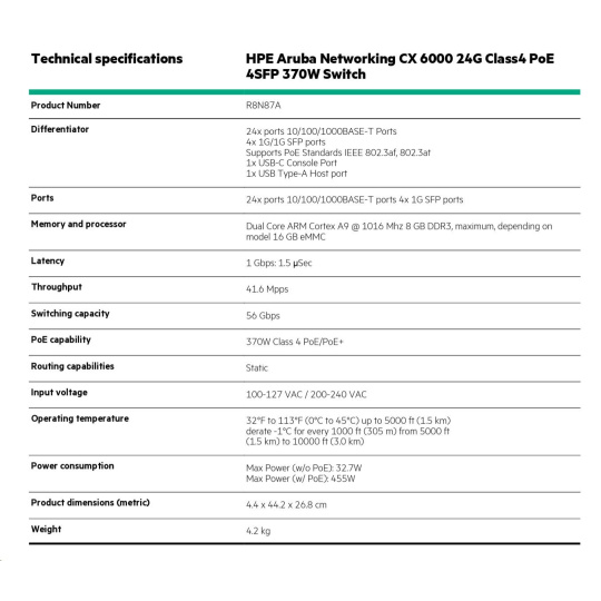 HPE Aruba Networking CX 6000 24p 10M/100M/1G Class4 PoE 4p SFP 1G 370W Switch R8N87B