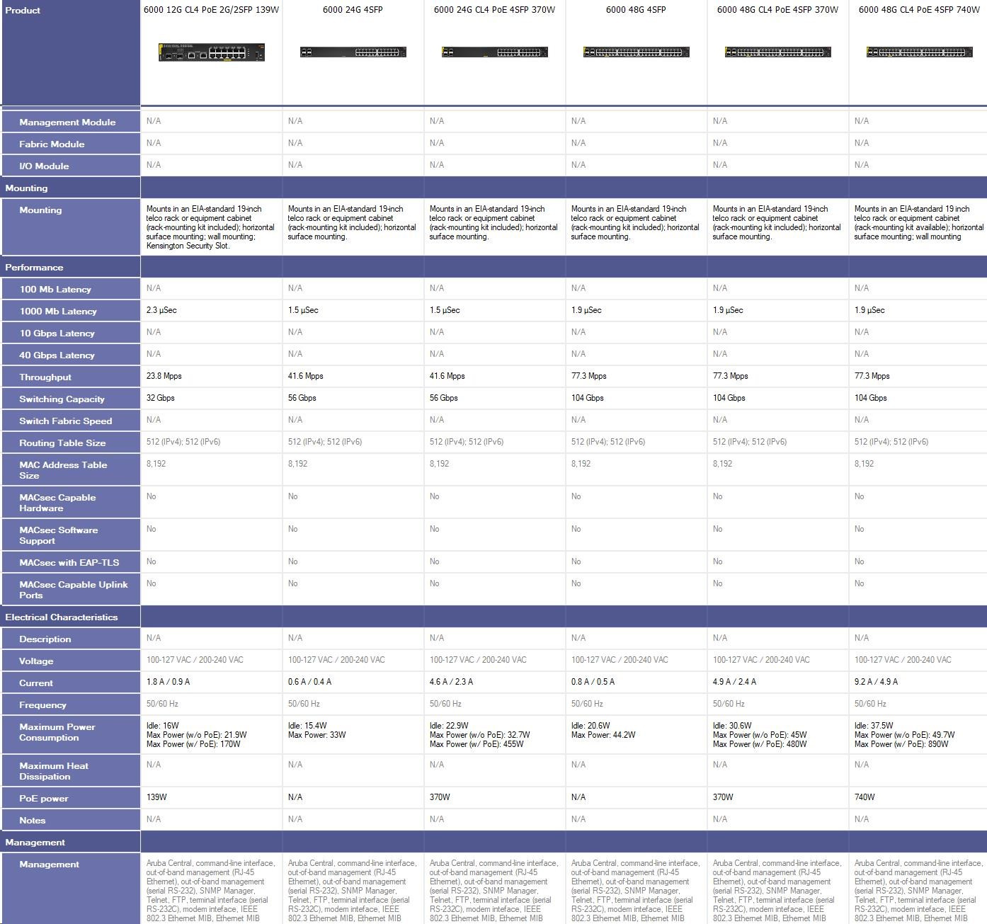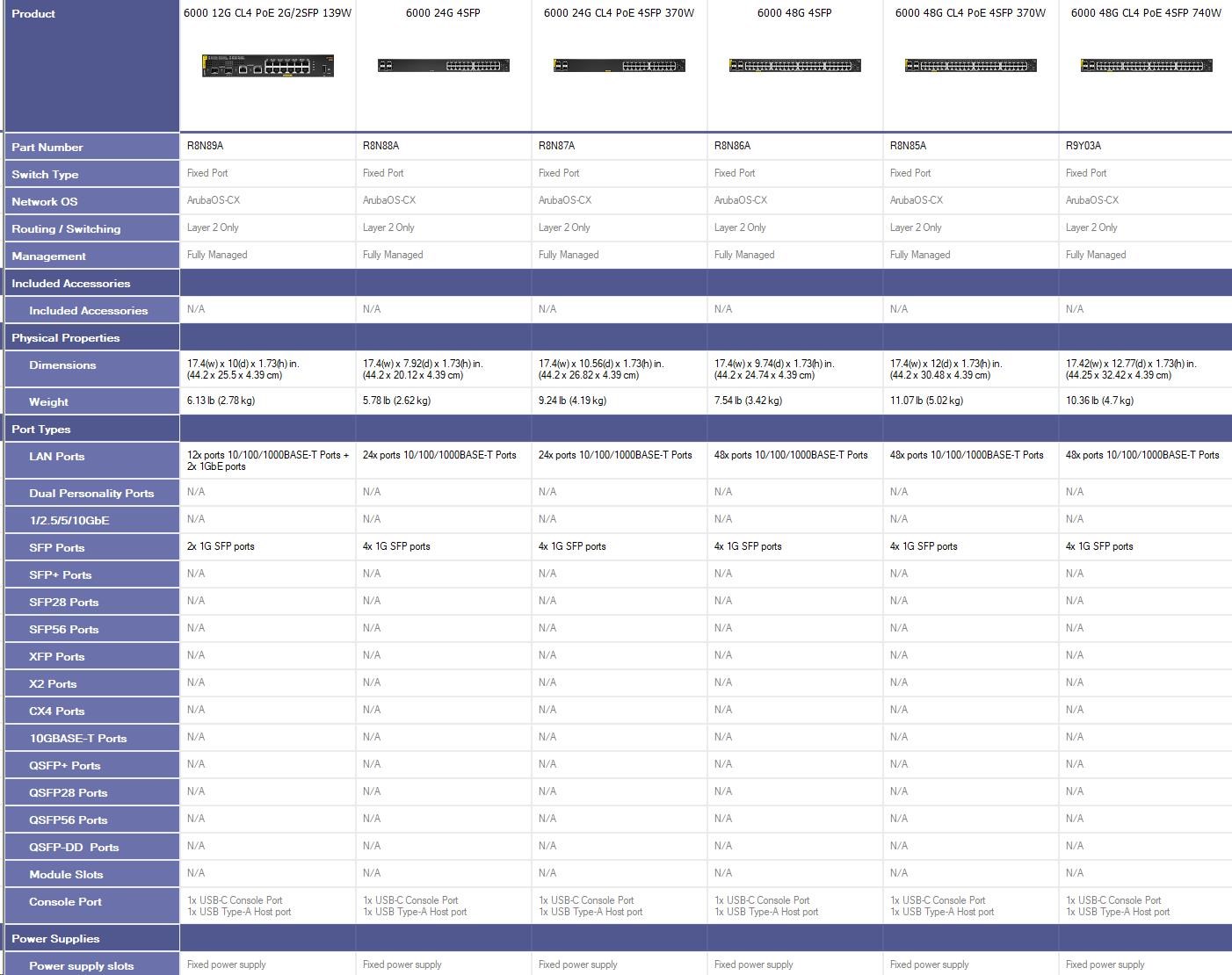 Aruba 6000 48G Class4 PoE 4SFP 370W Switch (R8N85A) | Aruba 6000 48G 4SFP Switch (R8N86A) | Aruba 6000 24G Class4 PoE 4SFP 370W Switch (R8N87A) | |
