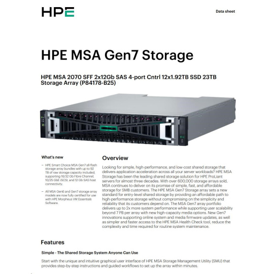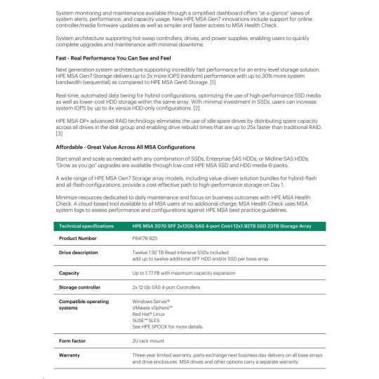 HPE MSA 2070 SFF 2x12Gb SAS 4-port Controller 12x1.92TB SSD 23TB Storage Array Smart Choice.