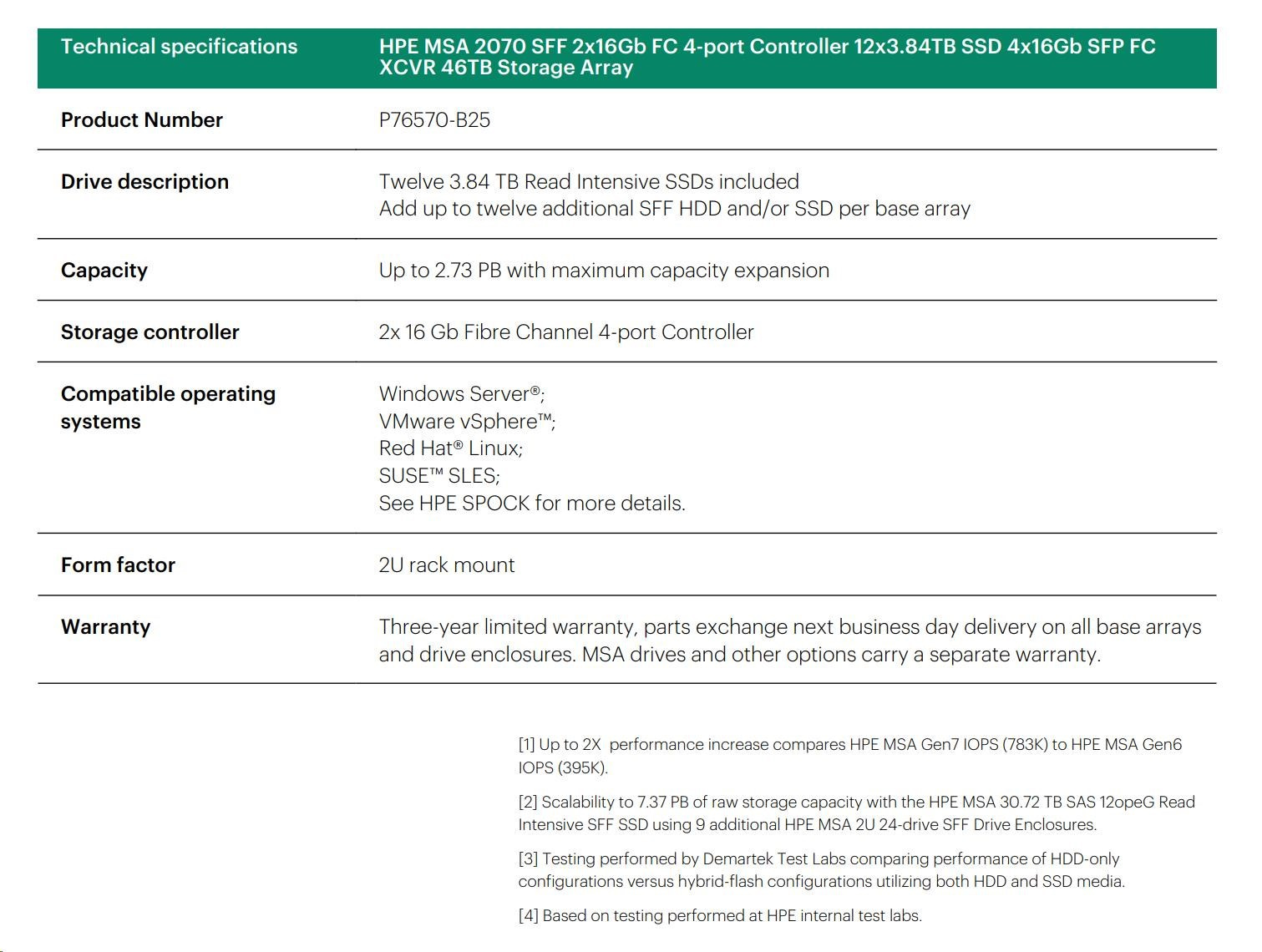 HPE MSA 2070 SFF 2x16Gb FC 4-port Controller 12x3.84TB SSD 4x16Gb SFP FC XCVR 46TB Storage Array