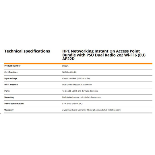 HPE Networking Instant On Access Point AP22D Bundle with PSU Dual Radio 2x2 Wi-Fi 6 (EU) AP22D.