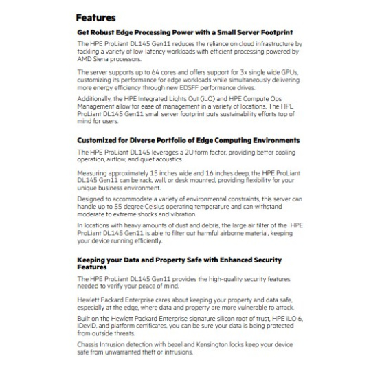 HPE ProLiant DL145 Gen11 snižuje závislost na cloudové infrastruktuře tím, že řeší různé pracovní zátěže s nízkou latencí pomocí efektivního zpracování poháněného procesory AMD Siena. Server podporuje až 64 jader a nabízí podporu pro 3x jeden široký GPU, přizpůsobuje svůj výkon okrajovým pracovním zátěžím a zároveň poskytuje vyšší energetickou účinnost prostřednictvím nových výkonových disků EDSFF. HPE Integrated Lights Out a Compute Ops Management navíc umožňují snadnou správu na různých místech. Malé rozměry serveru HPE ProLiant DL145 Gen11 kladou uživatelům důraz na úsilí o udržitelnost.