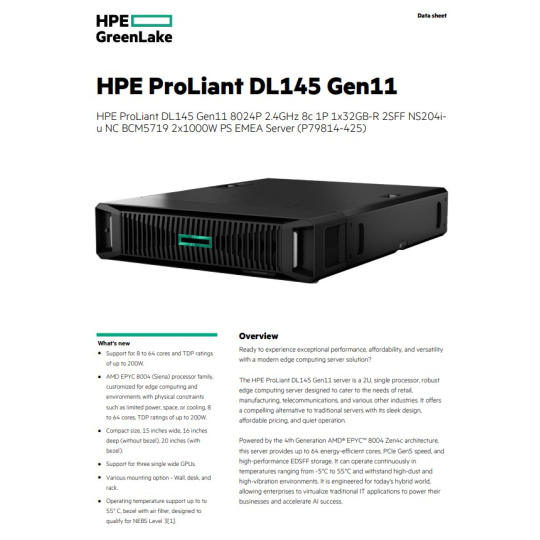 Server HPE ProLiant DL145 Gen11 je 2U, jednoprocesorový, robustní server edge computing navržený tak, aby vyhovoval potřebám maloobchodu, výroby, telekomunikací a různých dalších odvětví. Nabízí přesvědčivou alternativu k tradičním serverům s elegantním designem, dostupnou cenou a tichým provozem.