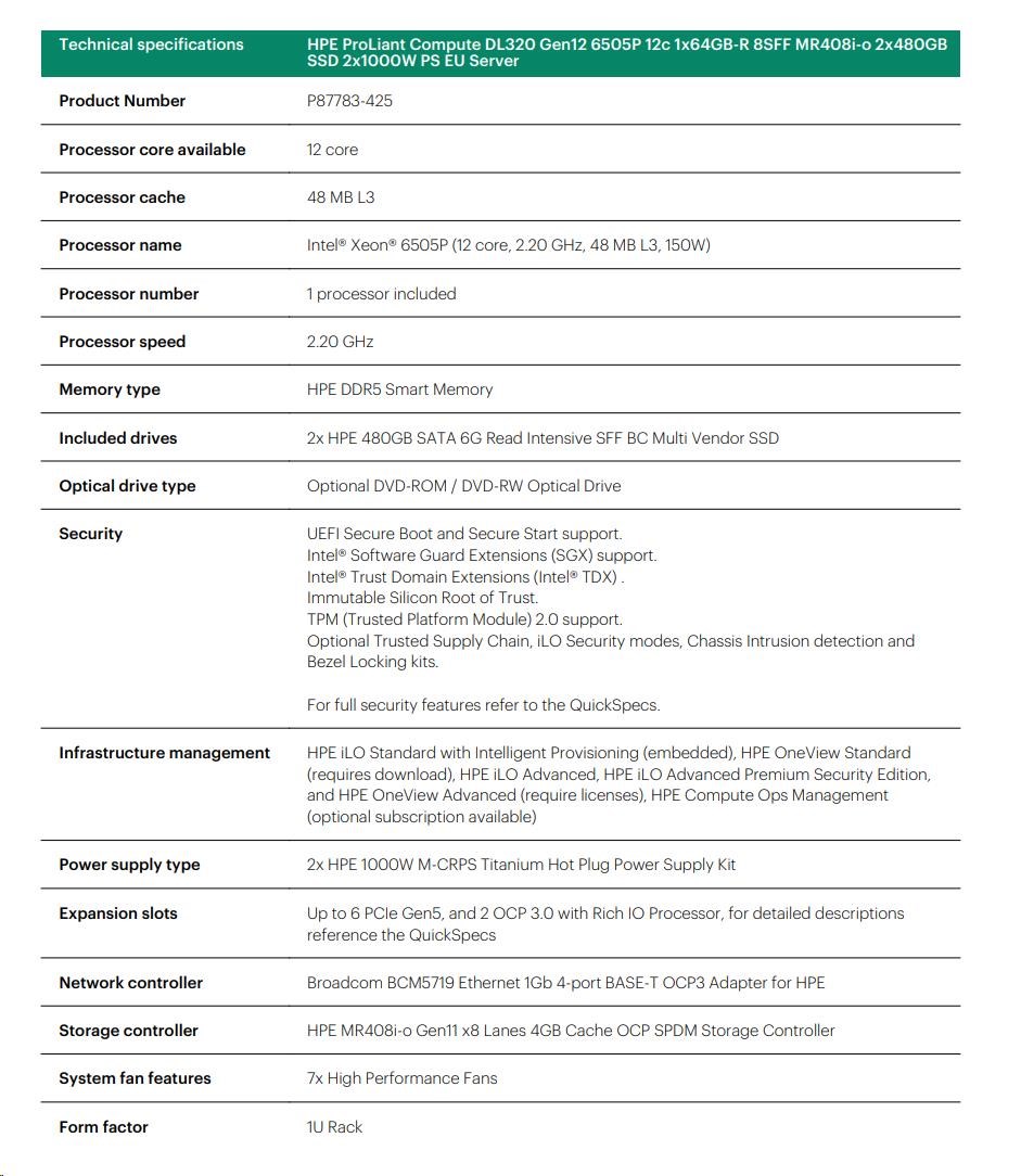 HPE PL DL320g12 6505P (2.2/12C) 1x64G (P69728) 2x480G MR408i-o 8SFF 2x1000W 1GbE NBD333 Smart Choice (P87783-425)