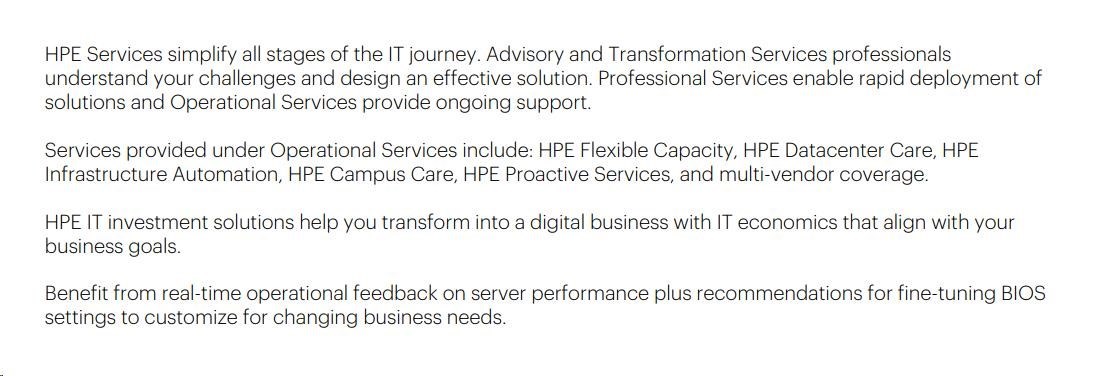 HPE Services simplify all stages of the IT journey. Advisory and Transformation Services professionals understand your challenges and design an effective solution. Professional Services enable rapid deployment of solutions and Operational Services provide ongoing support.
