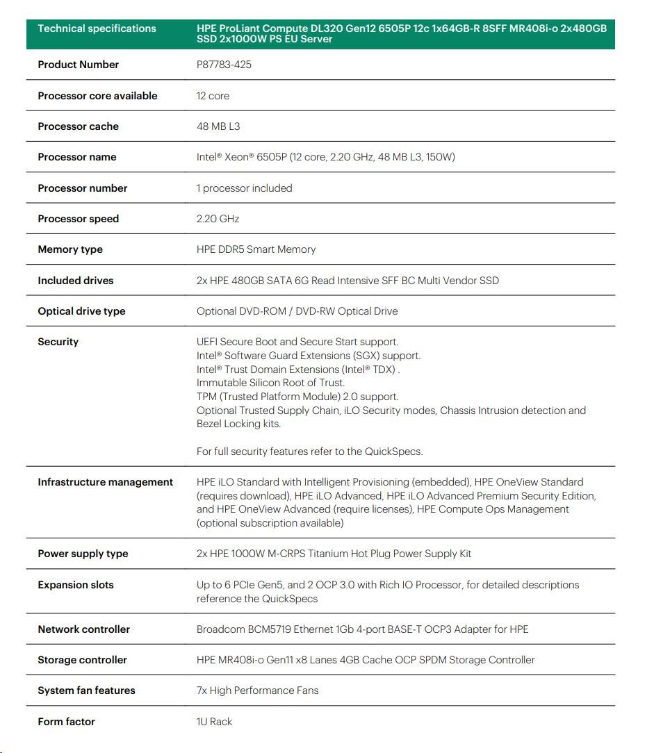 | Memory | 1x64GB HPE DDR5 Smart Memory |
