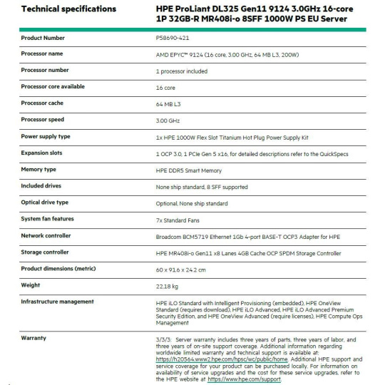 HPE ProLiant DL325 Gen11 9124 3.0GHz 16-core 1P 32GB-R MR408i-o 8SFF 1000W PS EU Server