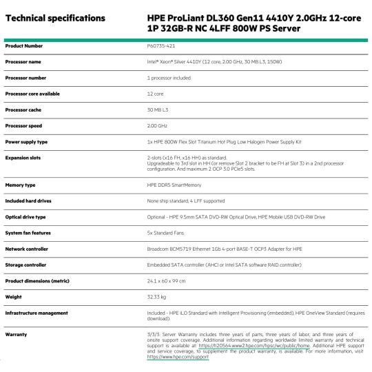 HPE PL DL360g11 4510 (2.4G/12C) 2x32G 2x960G VROC 4LFF LPC 2x800W 4x1G Smart Choice.