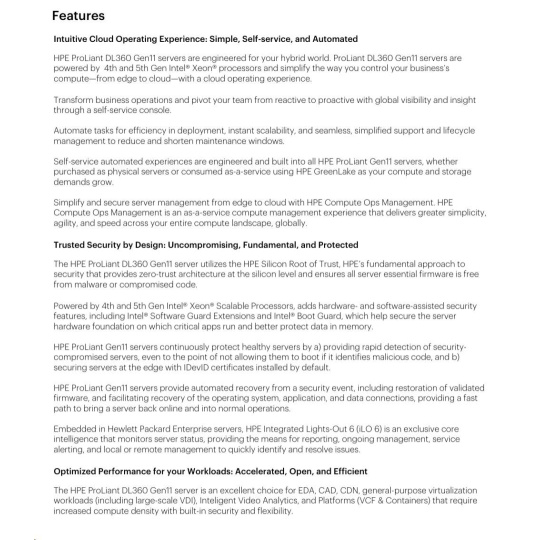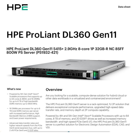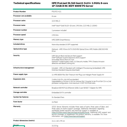 Model Name HPE ProLiant DL360 Gen11 5415+ 2.9GHz 8-core 1P 32GB-R NC 8SFF 800W PS Server