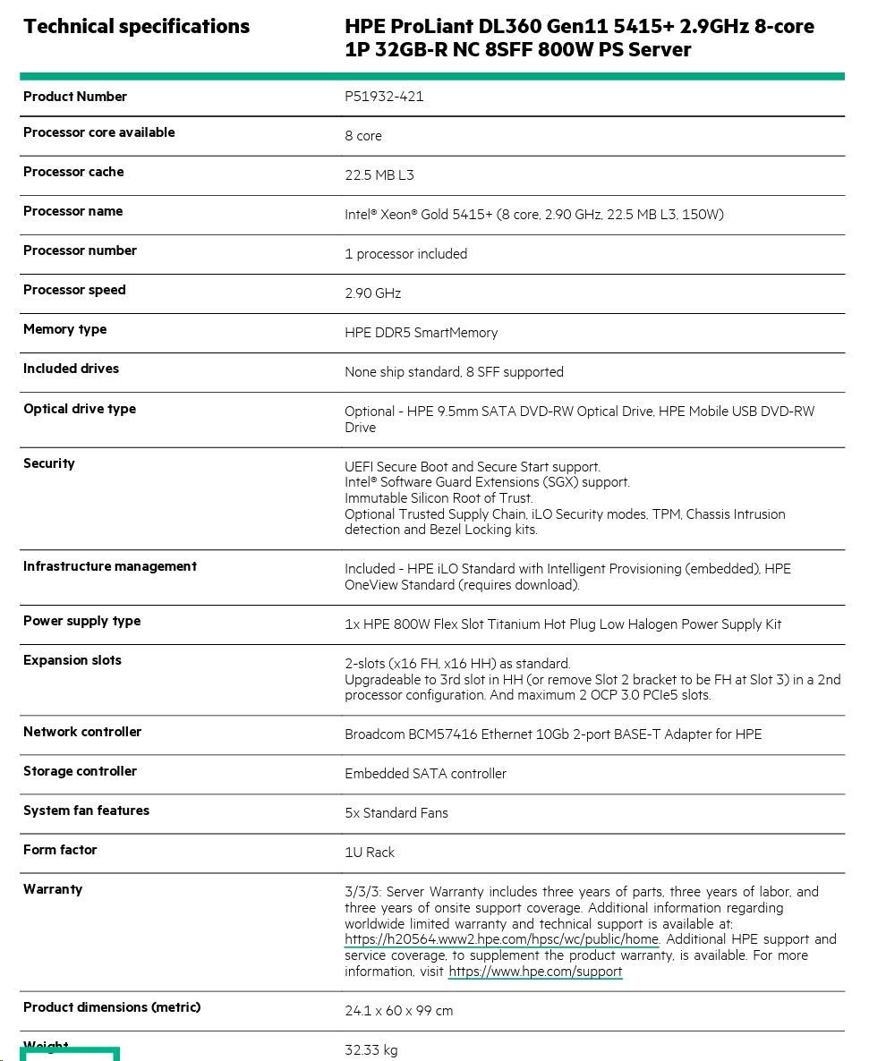 Model Name HPE ProLiant DL360 Gen11 5415+ 2.9GHz 8-core 1P 32GB-R NC 8SFF 800W PS Server