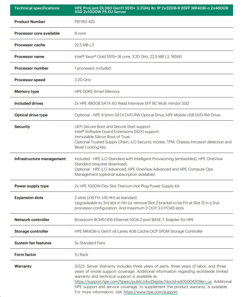 HPE PL DL360g11 5515+ (3.2G/8C) 2x32G (P64706) 8SFF MR408i-o/4G 2x480G 2x1000W 2x10G-T.