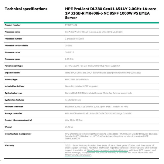 Model Name HPE PL DL380g11 4514Y (2.0/16C/30M) 32G MR408i-o/4G 8-26SFF 1000Wti 2x10G-T