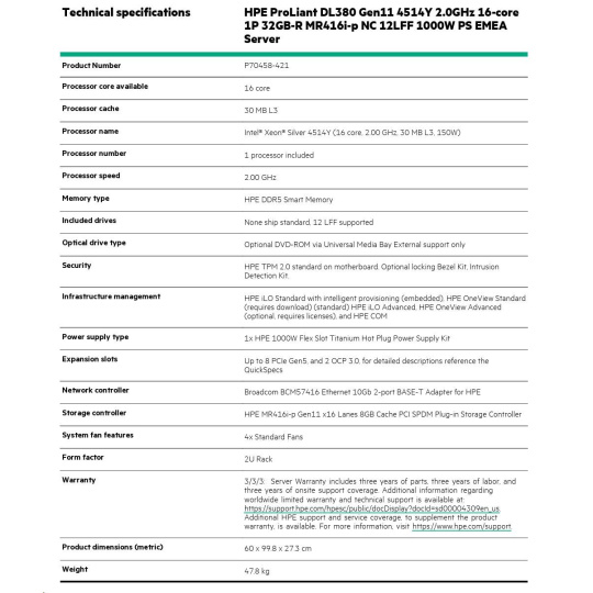 HPE PL DL380g11 4514Y (2.0/16C) 32G (p64706) MR416i-p/8G 12LFF 1000W 2x10G-T NBD333 2U P70458-421 RENEW