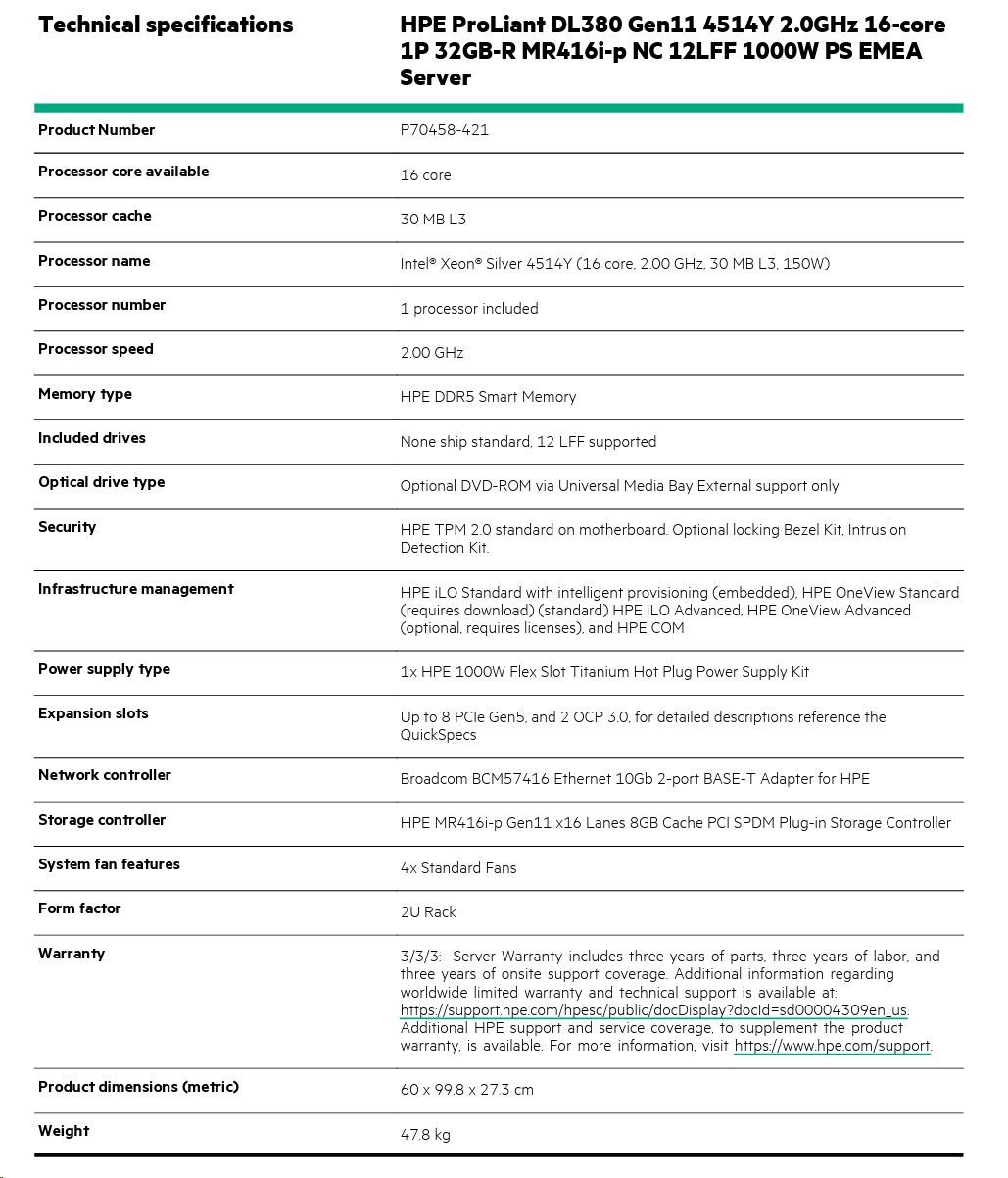 HPE PL DL380g11 4514Y (2.0/16C) 32G (p64706) MR416i-p/8G 12LFF 1000W 2x10G-T NBD333 2U P70458-421 RENEW