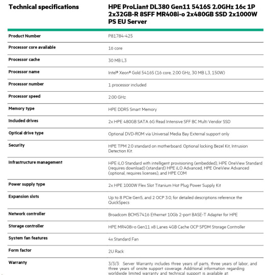 HPE PL DL380g11 5416S (2.0/16C) 2x32G (P43328) 2x480G MR408i-o/4G 8-26SFF 2x1000W 2x10G-T 2U Smart Choice.