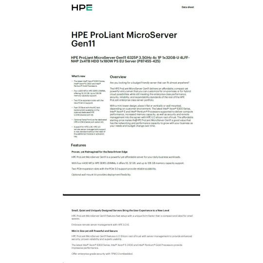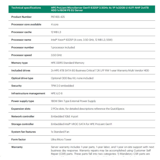 HPE PL MicroServer Gen11 6325P (3.5/4C) 1x32G 2x4TB SATA 4LFF/SFF-NHP VROC 4p1G iLoPort (P65741) NBD111 Smart Choice.