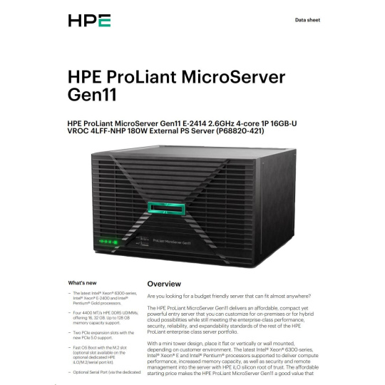 Technical specifications HPE ProLiant MicroServer Gen11 E-2414 2.6GHz 4core 1P 16GB-U VROC 4LFF-NHP 180W External PS Server P68820-421