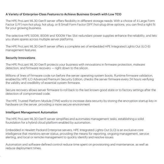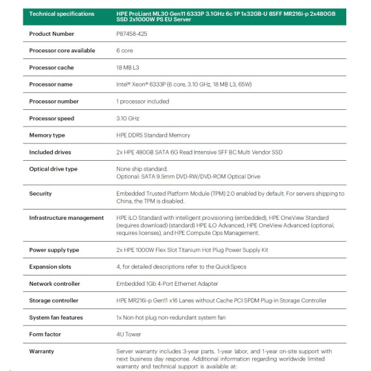 HPE PL ML30g11 6333P (3.1G/6C12T) 1x32G 2x480G 2x1000W MR216i-p 8SFF 4p1G NBD311 Smart Choice.