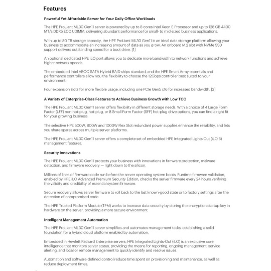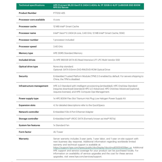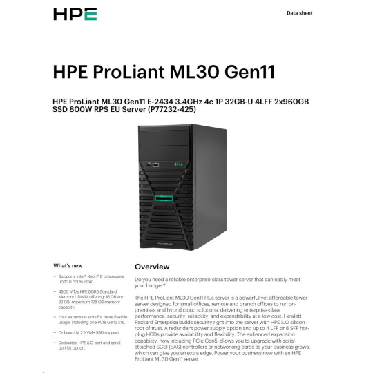 | Model Name | HPE ProLiant ML30 Gen11 E-2434 3.4GHz 4c 1P 32GB-U 4LFF 2x960GB SSD 800W RPS EU Server |