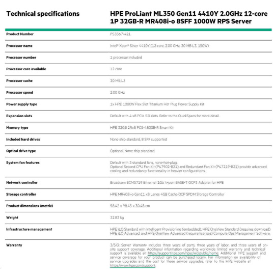 Model Name HPE ProLiant ML350 Gen11 4410Y 2.0GHz 12-core 1P 32GB-R MR408i-o 8SFF 1000W RPS Server