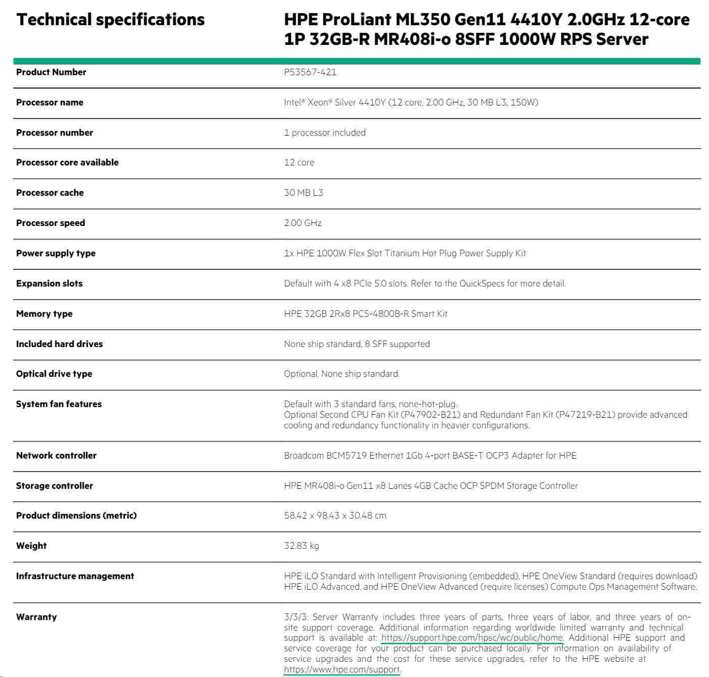 Model Name HPE ProLiant ML350 Gen11 4410Y 2.0GHz 12-core 1P 32GB-R MR408i-o 8SFF 1000W RPS Server