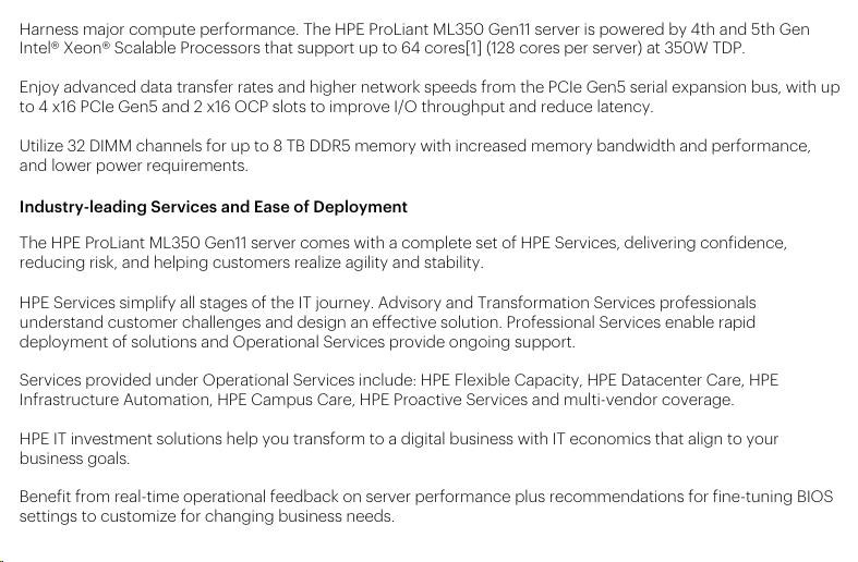 Optical Drive None ship as standard Notes: HPE ProLiant ML350 Gen11 Optical Disk Drive Cable Kit (P56608-B21) is required for optical drive.