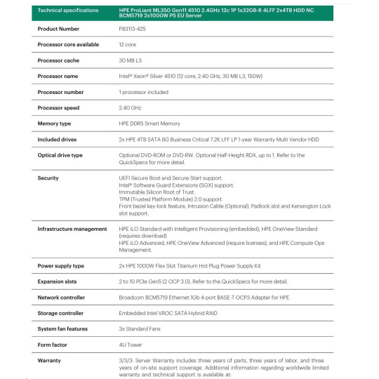 HPE PL ML350g11 4510 (2.4G/12C) 1x32G (P64706) 2x4TB/7.2k SATA LFF VROC 2x1000W 4p1G Smart Choice.