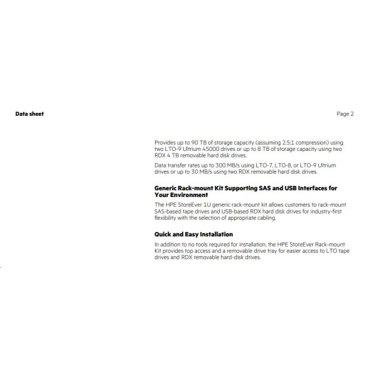 HPE StoreEver Rack-mount Kit is ideal for customers who have limited space in their rack as it allows for a smaller footprint leaving valuable space for other key components in the data center. The 1U HPE StoreEver Rack-mount Kit allows users to mix a variety of technologies, including LTO Ultrium, as well as RDX removable disk technology by selecting the appropriate cabling. The enclosures support standard internal LTO tape drives and HPE RDX Removable Disk Backup System, allowing for drive upgrades when you need additional capacity or want to migrate to a new generation of LTO tape drives or RDX removable disk technology.Data sheet Page 2 Provides up to 90 TB of storage capacity (assuming 2.5:1 compression) using two LTO-9 Ultrium 45000 drives or up to 8 TB of storage capacity using two RDX 4 TB removable hard disk drives. Data transfer rates up to 300 MB/s using LTO-7, LTO-8, or LTO-9 Ultrium drives or up to 30 MB/s using two RDX removable hard disk drives.