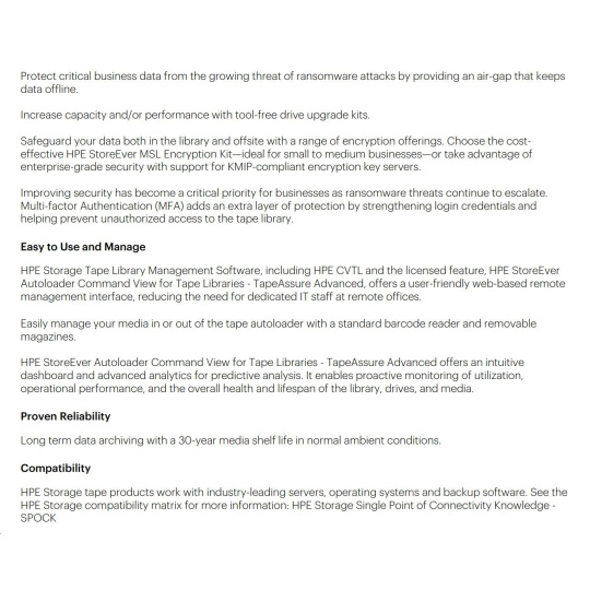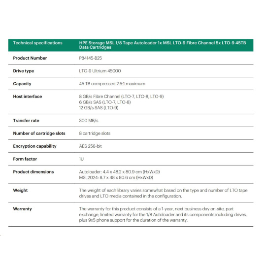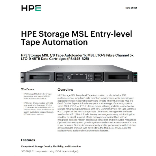 HPE Storage MSL 1/8 Tape Autoloader 1x MSL LTO-9 Fibre Channel 5x LTO-9 45TB Data Cartridges.