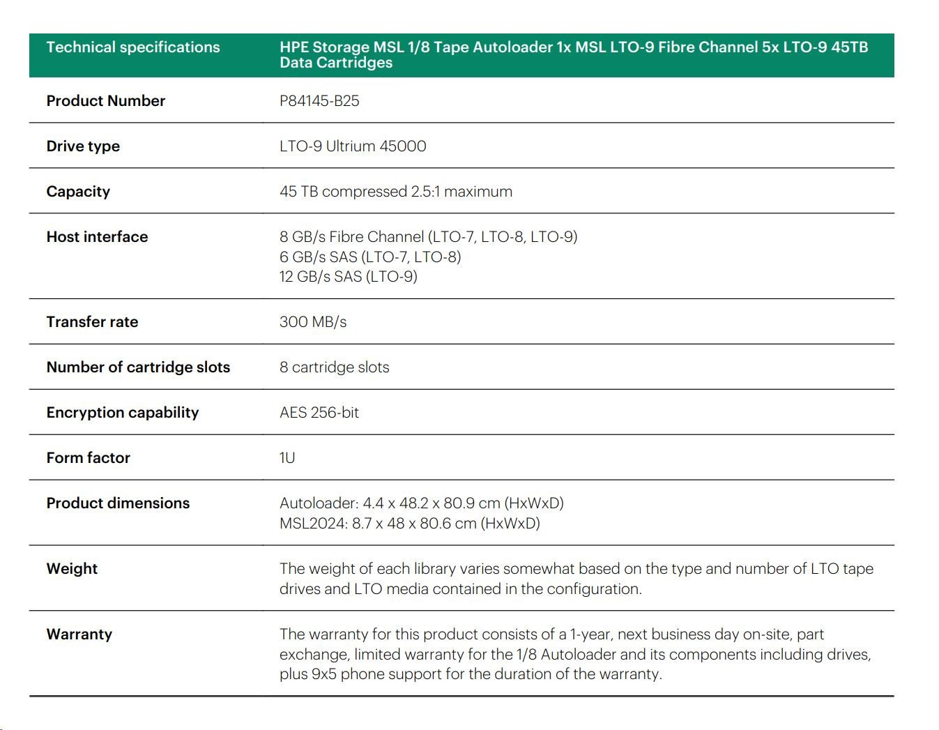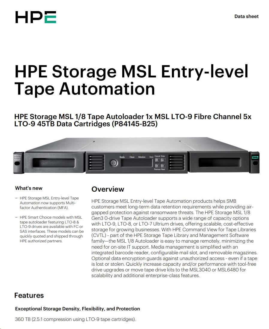 HPE Storage MSL 1/8 Tape Autoloader 1x MSL LTO-9 Fibre Channel 5x LTO-9 45TB Data Cartridges