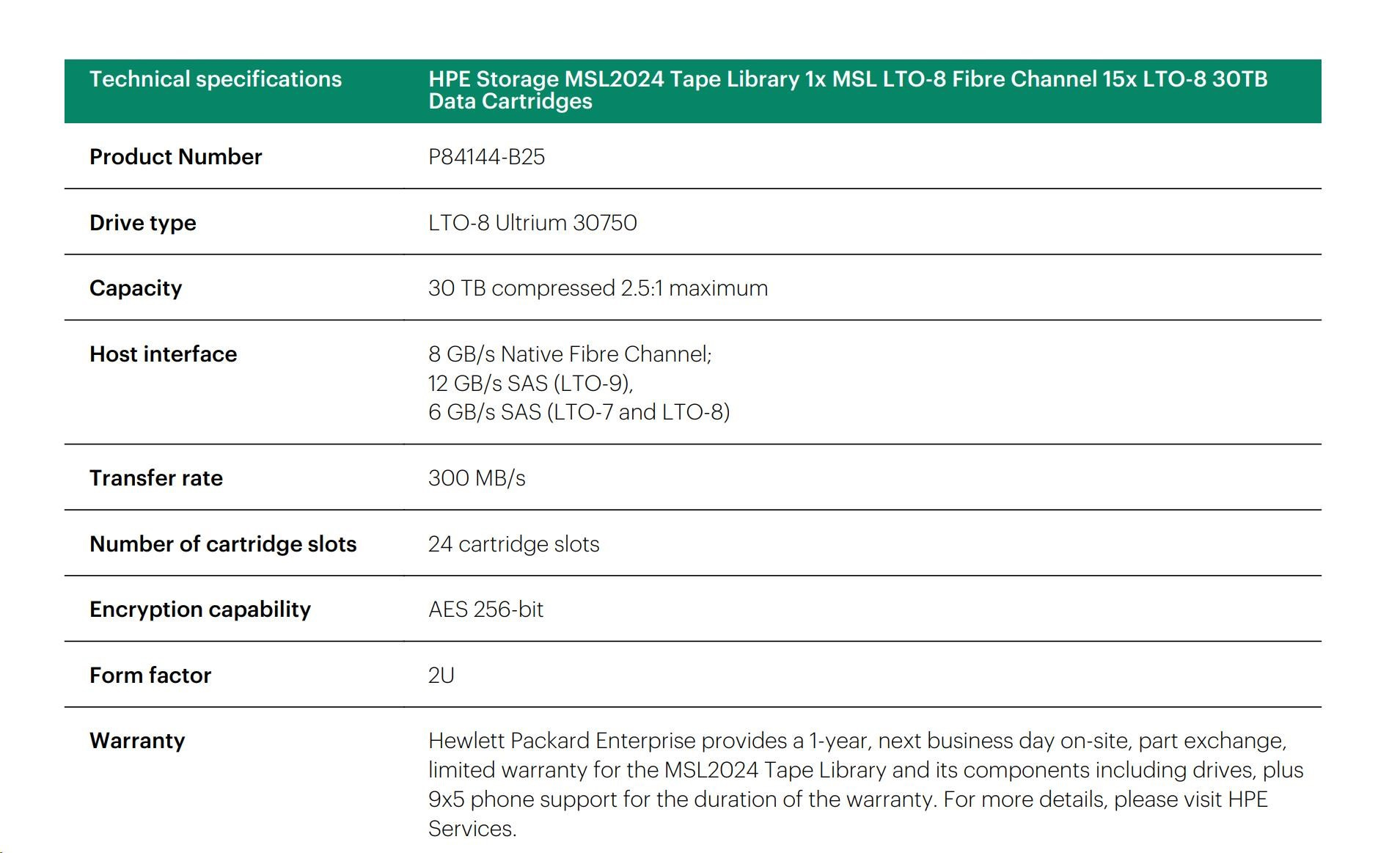 HPE Storage MSL2024 Tape Library 1x MSL LTO-8 Fibre Channel 15x LTO-8 30TB Data Cartridges P84144-B25