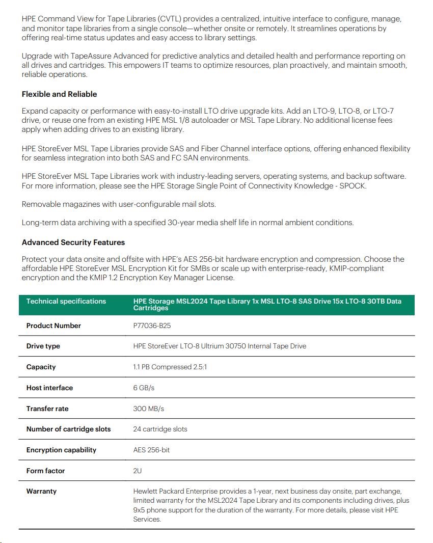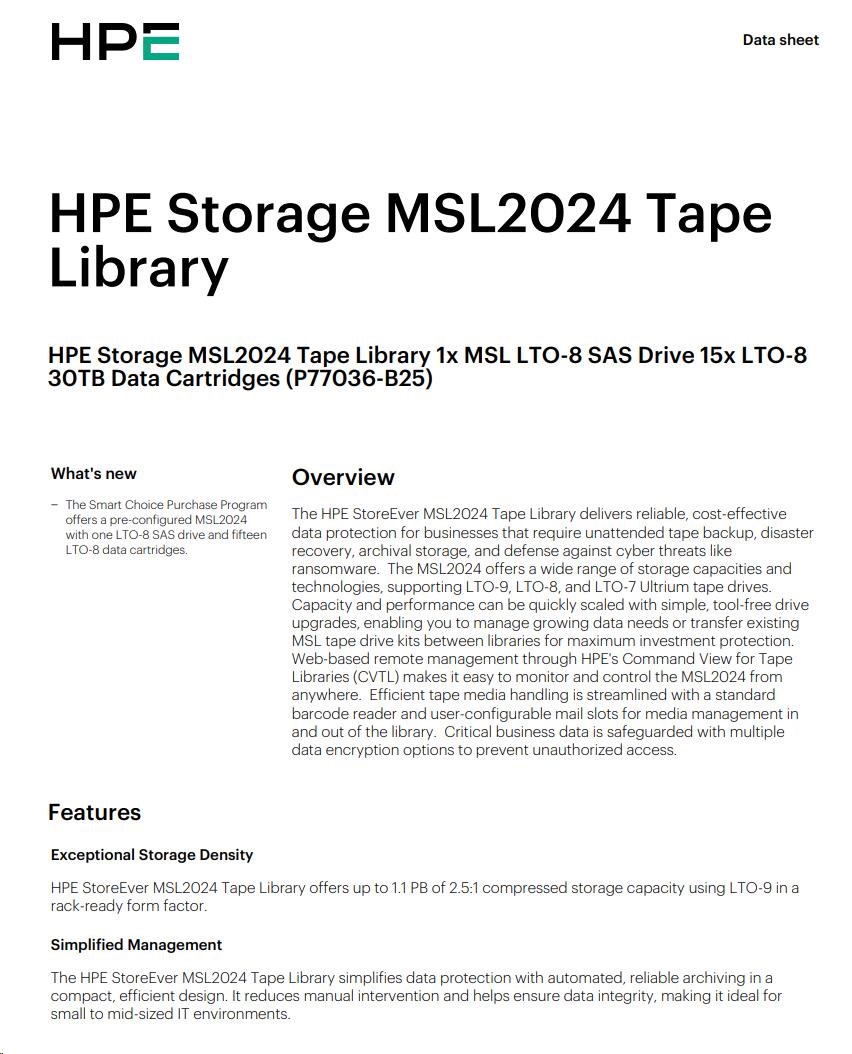 HPE Storage MSL2024 Tape Library 1x MSL LTO-8 SAS Drive 15x LTO-8 30TB Data Cartridges