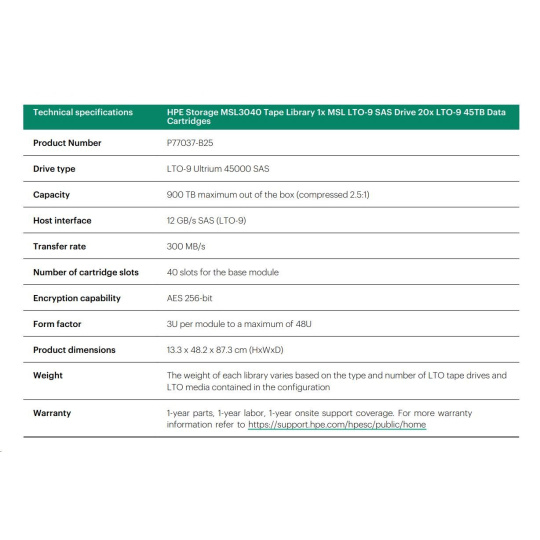 HPE Storage MSL3040 Tape Library 1x MSL LTO-9 SAS Drive 20x LTO-9 45TB Data Cartridges.