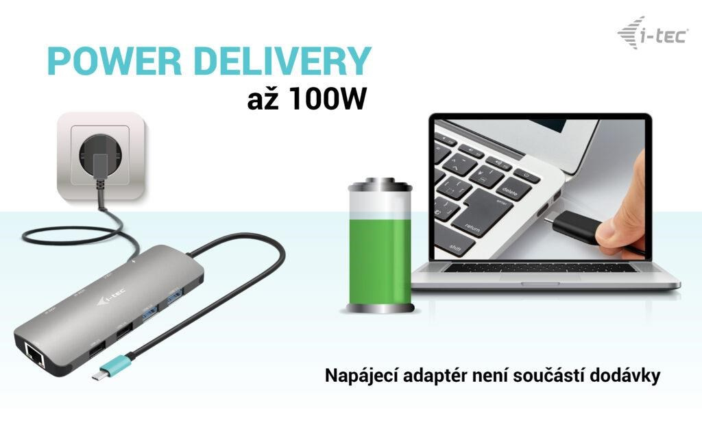 - Dokovacia stanica podporuje až 100W napájanie pripojeného notebooku alebo tabletu (nabíjačka USB-C nie je súčasťou balenia)