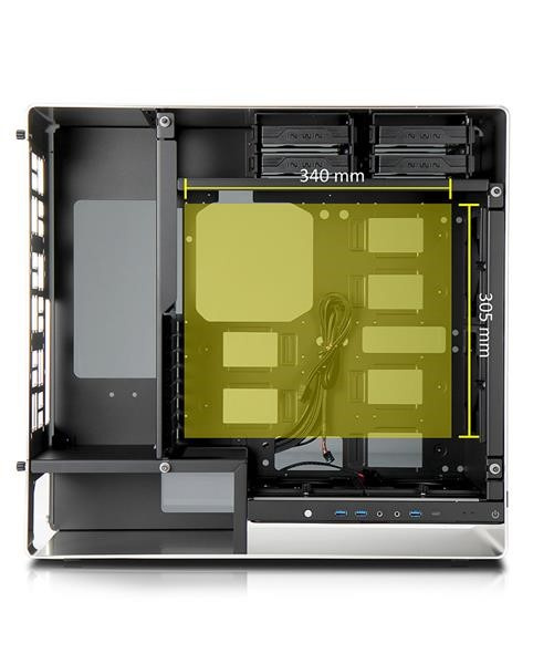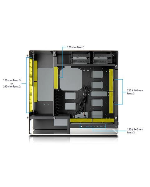 Oddelené pozície pre HDD a PSU zabezpečujú ideálne prúdenie vzduchu cez zadné vetracie otvory do vonkajšieho priestoru bez toho, aby teplému vzduchu bránili základné dosky alebo grafické karty.
