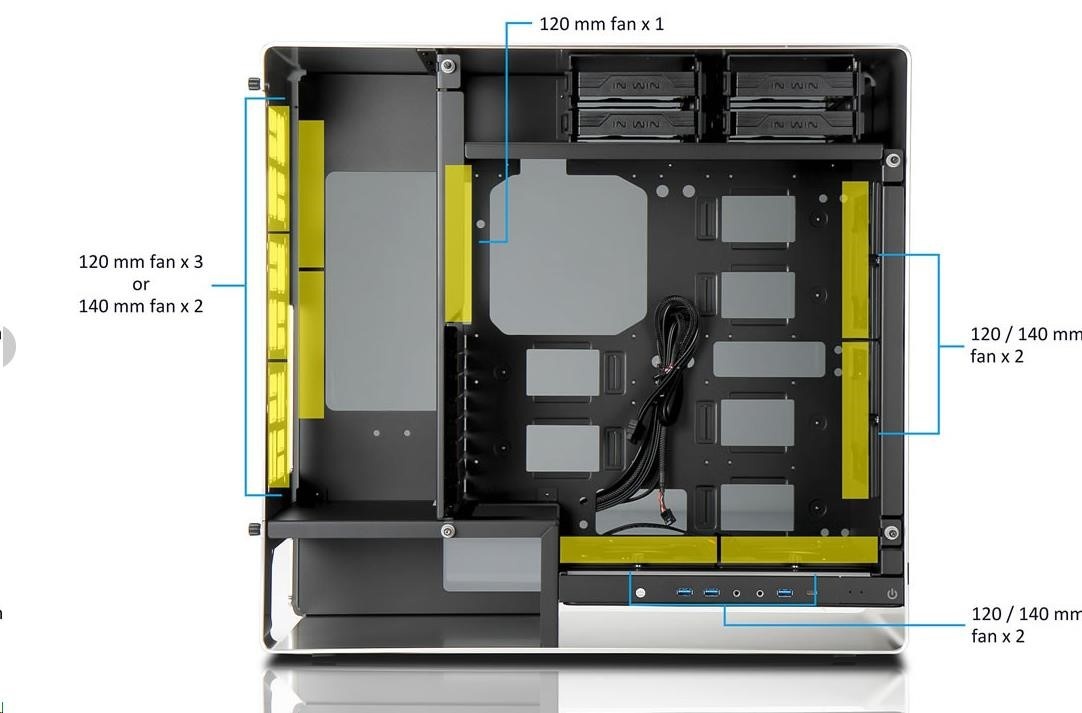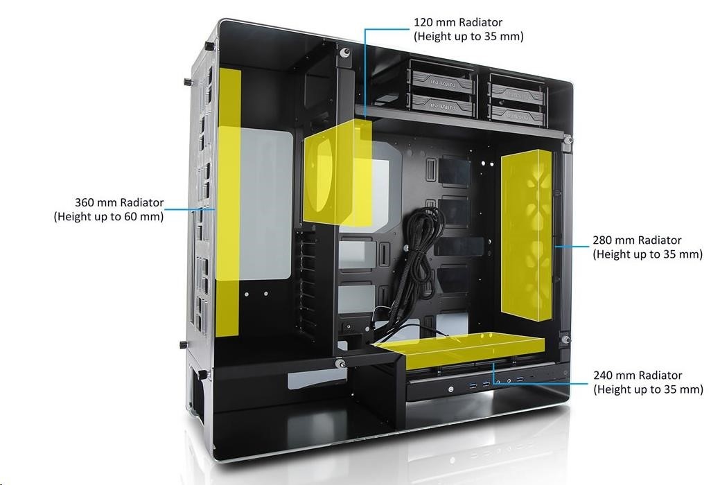 Oddelené pozície pre HDD a PSU zabezpečujú ideálne prúdenie vzduchu cez zadné vetracie otvory do vonkajšieho priestoru bez toho, aby teplému vzduchu bránili základné dosky alebo grafické karty.