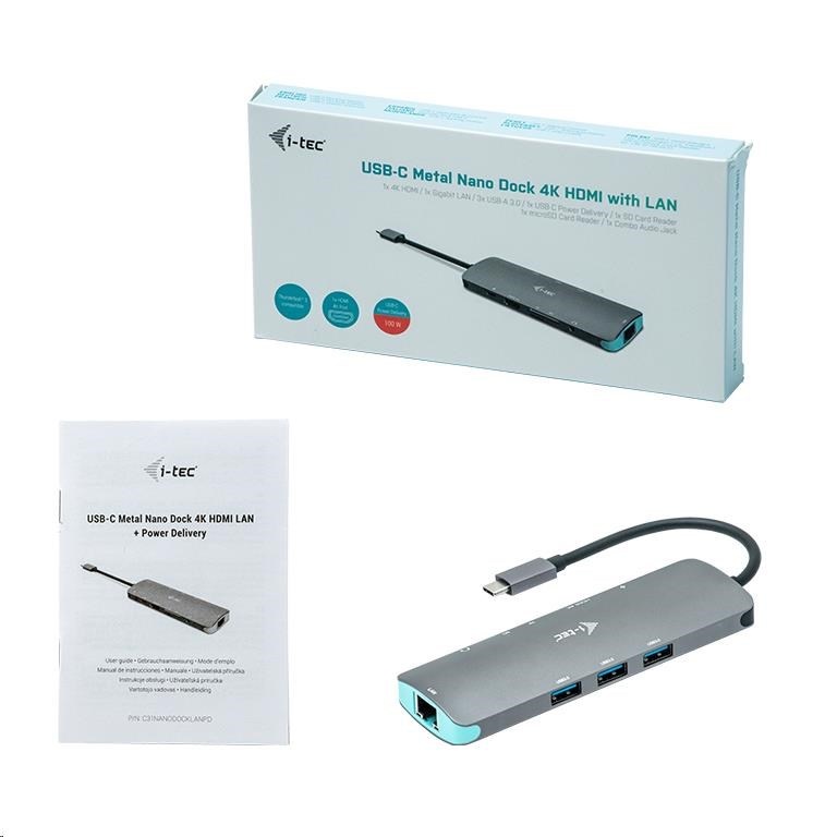 Dlhý popis produktu: i-tec USB-C Metal Nano Docking Station - 1x HDMI 4K Ultra HD 3840×2160@30Hz, 1x čítačka kariet SD, 1x čítačka kariet microSD, 1x Ethernet GLAN RJ-45, 1x kombinovaný audio konektor, 3x USB 3.0, 1x port USB-C Power Delivery (100 W), kompatibilný s Thunderbolt 3