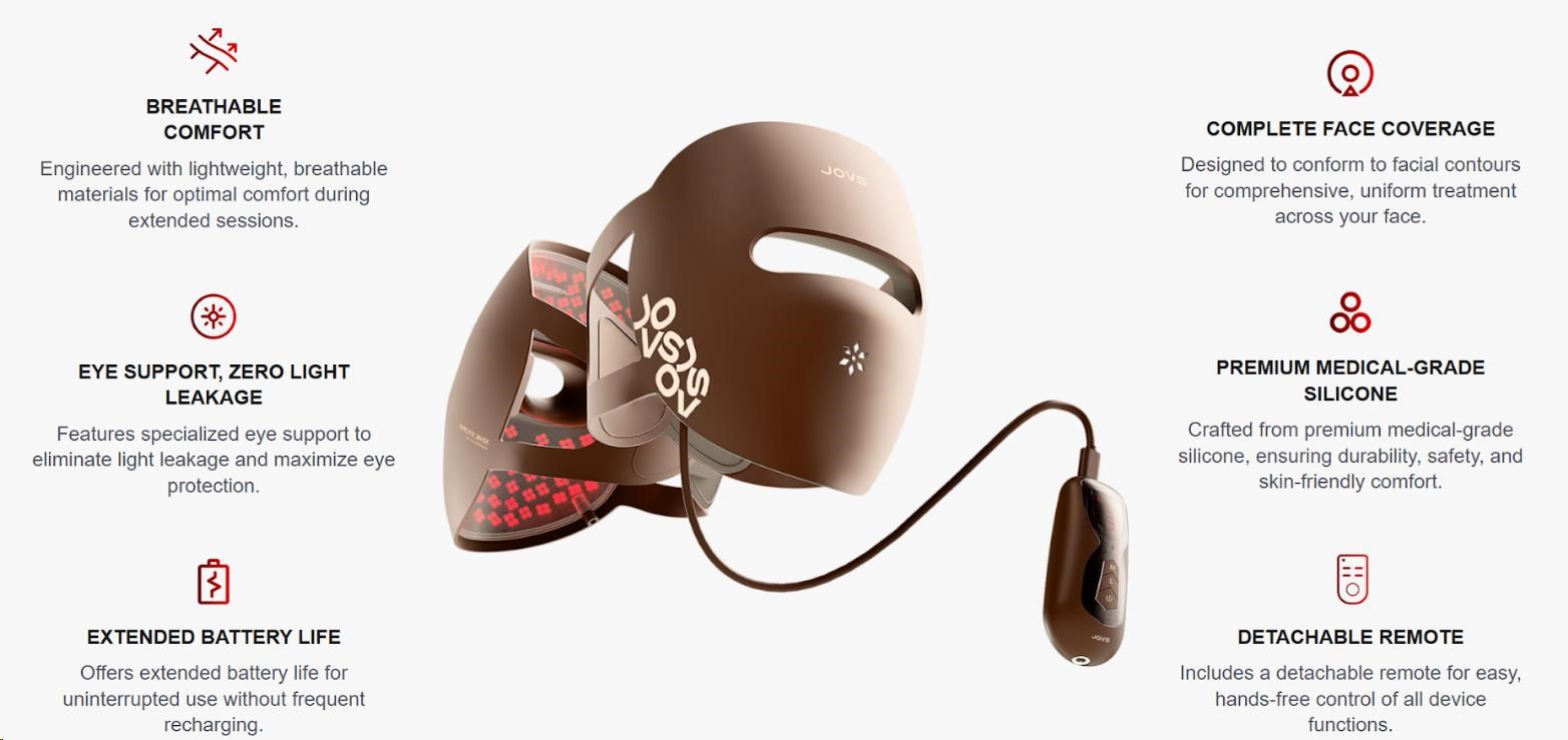 Predstavte si pleť, ktorá je deň čo deň čistejšia, pevnejšia a viditeľne mladšia. S maskou JOVS sa táto vízia stáva realitou. Vďaka pokročilej optickej technológii s 98% účinnosťou prenosu svetlovej energie preniká hlboko do pokožky a prináša viditeľné výsledky už za 4-6 týždňov pravidelného používania. S komfortným bezdrôtovým dizajnom sa váš denný rituál stane chvíľou relaxácie, na ktorú sa budete tešiť.